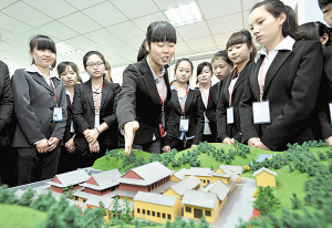 昨天上午,星空官方入口10级导游班的张琴飞正在沙盘前进行解说。从昨天起,该校旅游学院将每周一定为“旅游职业日”。(严龙 毛京宇 傅祖栋 摄)来源:《宁波日报》20