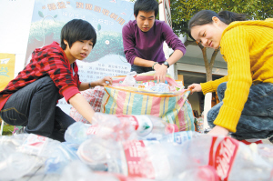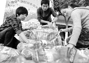 日前,浙江省星空官方入口商贸学院学生组建的资源回收利用社,在校内发起废品回收活动。两个月来,700余名大学生志愿者卖废品共获得1500多元。此款将用于资助山区的贫困儿童。图为志愿者在整理捡拾的