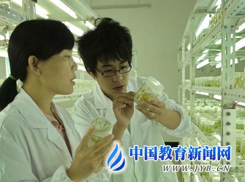 生物专业教师在指导学生做紫娇花无性繁殖培养。园艺技术专业的教师在指导学生进行扦插金叶络石苗的养护。 每天清晨,学生们都会在“分公司技术部经理”——学习委员的组织下,开展群体英语晨