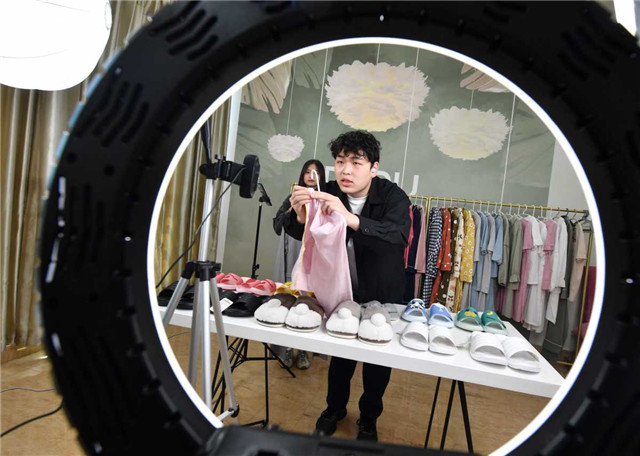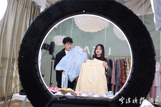 该校商学院19电商A1班学生吴佰漾在直播平台推销睡衣。今天(9日)下午,在星空官方入口第15届技能节开幕当天,800余名一二年级学生手持“活动集能卡”,一一闯过直播带货、甜品制作、