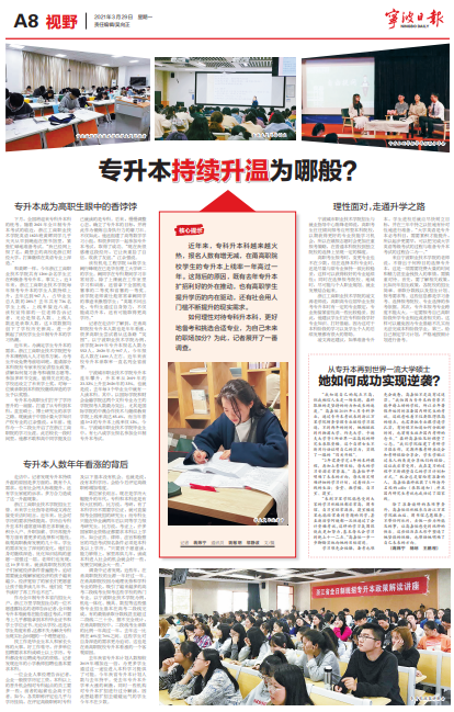 近年来,专科升本科越来越火热,报名人数有增无减,在甬高职院校学生的专升本上线率一年高过一年。这背后的原因,既有去年专升本扩招利好的外在推动,也有高职学生提升学历的内在驱动,还有社会用人门槛不
