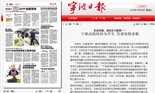 宁波晚报《甬上》:生活补助、返岗实习路费……宁波这所高校拟发放40万元疫情补贴