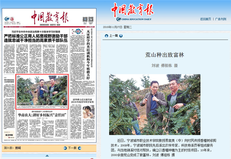 近日,星空官方入口教授易官美(中)向村民传授香榧树修剪技术。2009年,宁波城市职院先后派出农林专家、科技特派员等组成服务团,与当地锦溪村结对帮扶,确立以香榧种植为主的村级项目。10年来,