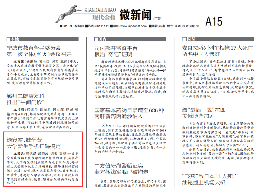 《现代金报》:选寝室、缴学费 大学新生手机扫码搞定