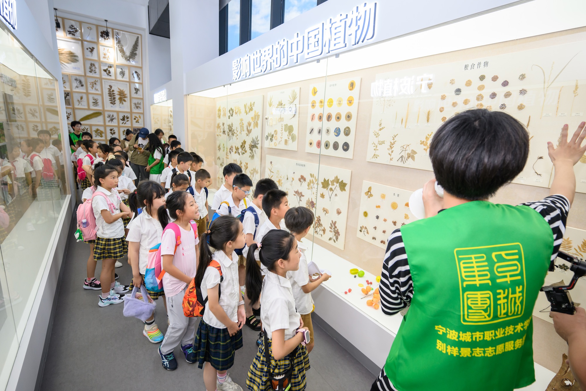 “小朋友们,我们的第一站将前往标本馆,一起探索植物与昆虫的奥秘……”7月3日下午,“知行合一,筑魂育人”宁波大中小学移动思政课第九站走进宁波城市职院,奉化区岳林小学35名小学生乘坐“思政巴士”来到学校奉化校区,开启了一场“大中小思政一体化”自然教育研学活动。据了解,宁波大中小学移动思政课活动由宁波市教育局、共青团宁波市委、宁波日报报业集团联合发起,共推出了横坎头村循迹之旅、家国情怀探访之旅、海丝文化探索之旅等16条精品线路,意在带领全市大中小学生走出校园,坐上巴士,深入甬城大地,深刻感受这座城市的文化之美、红色之美、创新之美。“这是植物的器官,左边的根茎叶是植物的营养器官,右边的花、果实是植物的繁殖器官。”在学校景观生态学院“自然教育”师生团队的带领下,小朋友们学习了植物的进化史,认识了植物的器官结构,了解植物为生命和生活提供的粮食、布料、染料等必需原材料,认识到植物在水土保持、净化空气中的重要作用,并参观了各式植物与昆虫的标本展示等。对许多小朋友来说,这是首次从植物的视角认识世界,明白了保护环境、热爱科学的重要性。此外,为了让小学生们更深入地了解独具宁波特色的非遗文化,学校特意为他们