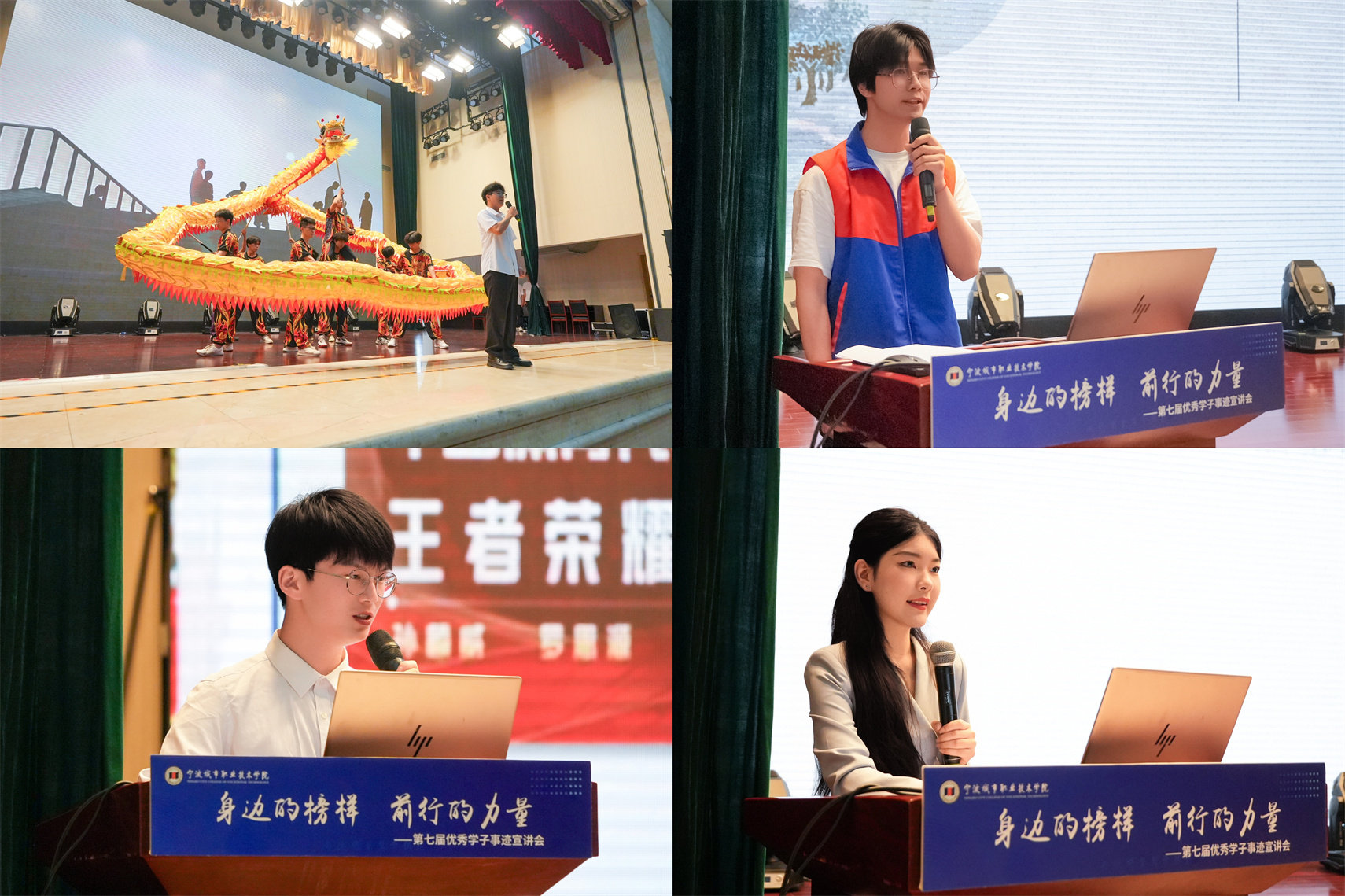 5月8日下午,第七届“身边的榜样前行的力量”优秀学子事迹宣讲会在鄞州校区综合楼礼堂举行。首场宣讲活动由学校国际学院(宁波TAFE学院)承办,学生工作部、国际学院负责人,各二级学院副书记、辅导员及学生代表参加。宣讲会上,来自不同学院的优秀学子们纷纷走上舞台,用真挚的情感和生动的语言,讲述了他们不平凡的成长经历。景观生态学院的舞龙队以“在少年故事中画龙点睛”为主题,展示了他们在追梦与传承中的坚持与努力;艺术学院的庞嘉浩以“行走的青春”为题,诠释了在服务奉献中实现自身的人生价值意义;信息与智能工程学院的诸狄钏以“用键盘敲出不被定义的人生”为主题,鼓励同学们勇于突破自我,担负起“技能强国”的责任;国际学院的徐冰婕则用“三个敢于”铺就成长之路,表达了她将兴趣化为动力,讲好中华传统文化与科学家精神的决心。宣讲活动结束后,学生工作部负责人作总结发言。她鼓励同学们要赓续五四精神,以身边的榜样为标杆,在榜样的青春故事中,汲取奋发有为的力量,在中国式现代化建设中挺膺担当。作为学校思想政治教育的重要活动之一,“身边的榜样”优秀学子事迹宣讲旨在引导广大青年学生向先进典型学习,找准方向对标提升。接下来,宣讲团的