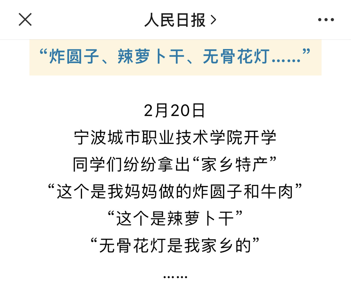 2月27日,人民日报官微报道学校新学期开学,同学们纷纷拿出“家乡特产”与同学分享,并点赞评论道:“家乡特产”在期待中被开启,分享的不仅仅是家乡的特色美食,还有各个地区的风俗文化。连日来,共青团中央、新华社《半月谈》、光明网、人民网、学习强国等多家主流媒体及单位的官微纷纷聚焦报道此事,全网阅读量超百万,充分展示了学校学生良好的精神风貌和综合素养,为新学期开好局、起好步营造了良好舆论氛围。2月20日是春季学期学生报到的日子。学校提前组织谋划、精心策划选题、统筹外宣内宣,联合甬派客户端、现代金报通过现场直播的方式直击开学,就学校开学准备情况、校园活动、新学期新目标等进行了集中宣传展示。期间,特别就“大学生返校行李箱里带了啥?”这一话题,对学生进行了随机采访、现场“开箱”,半小时的直播观看量突破28万。当天,宁波发布、宁波教育、宁波晚报、甬派客户端等报网端微多平台进行了跟进报道,引发网民关注。下步,学校将围绕中心工作,坚持融媒体报道思维,加强选题策划与传播创新,及时宣传好师生先进典型,全面宣传好学校办学成效。
