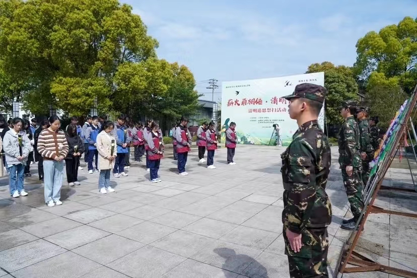 又是一年青草绿,又是一年清明时。清明节前夕,宁波城市职院的大学生们或走进革命烈士故居、陵园,或重温清明传统习俗,或开展一场特殊的生命教育,来感悟家国清明、盛世昌荣,青年应担当。退役大学生再着军装缅怀英烈巍然伫立的革命烈士纪念碑下,一群退役复学的大学生身着军装,整齐列队,行军礼,献花圈……3月26日,学校退伍军人协会全体成员走进鄞州区章水镇樟村革命烈士陵园,用军人特有的方式致敬英雄先烈。在烈士纪念馆内,军协成员通过图文资料了解英雄生平故事,重温先烈们奋勇杀敌、保家卫国的壮举。成员石广宇表示,在今后的学习工作中一定要把部队养成的优良作风发扬光大,以英雄先烈为榜样,为国家建设贡献青春力量。大学生携手中学生同上一堂思政课4月1日,海曙区后屠桥革命烈士陵园迎来一群年轻访客——来自商学院的大学生和宁波经贸学校的中学生。两校60余名师生逐一向革命烈士纪念碑敬献鲜花并参观后屠桥战斗纪念馆,重温新四军在四明山刻骨铭心的抗战史。现场,商学院“军魂宣讲团”还带来了《81192,请返航——王伟烈士事迹》思政微课。宁波经贸学校的王玉静同学表示,“感谢学长们的精彩讲述,让我深刻体会到今天幸福生活的来之不易,我们不