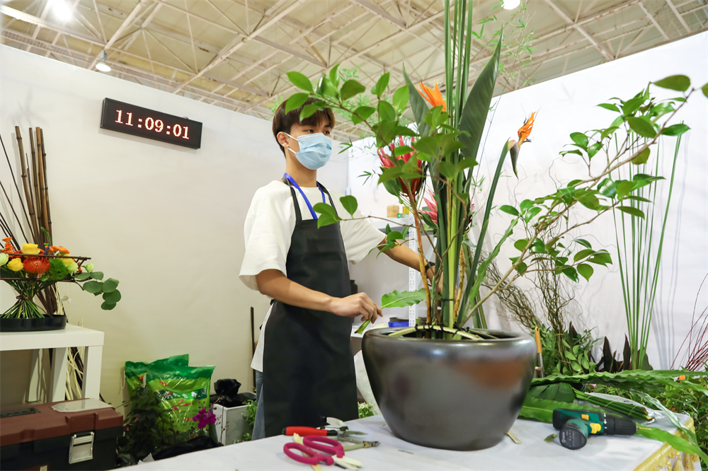 浙江省职业院校技能大赛高职组“花艺”赛项现场一花一世界,鲜花传递语言、匠心和情趣。9月24日,由浙江省教育厅主办、我校承办的2022年浙江省职业院校技能大赛高职组“花艺”赛项正式拉开帷幕,14所省内高职院校、27名花艺“高手”走进宁波城市职院,展开一场精彩绝伦的花艺技能大比拼。比手速、比技能经验,更比构思、创意审美等综合素养一人一操作台,每个台子上摆放着数量相等、种类一致的花材、容器和辅材。校文传记者走进比赛现场看到,偌大的篮球馆被分割成相同面积的白色工位,选手们面对同样的“材料”,要完成中国传统插花作品创作与现代花艺作品创作两项内容,其中现代花艺部分比赛时长2-3 小时,共二个模块,花束、新娘花饰、切花装饰、植物设计中四选二,中国传统插花部分比赛时长 1-1.5 小时,共二个模块,瓶花、盘花、筒花、篮花、碗花、缸花六个模块中,六选二。这种紧张的定时赛,无不考验着选手们的心态、手艺和技能掌控力。比赛现场“现在比赛的是现代花艺赛项,要求选手在两个小时内创作出一件作品,我们会从整体造型、材料选择、创意搭配等多维度标准对选手们的作品进行评比。现代花艺给选手的发挥空间更大,从中考验出选手的技能