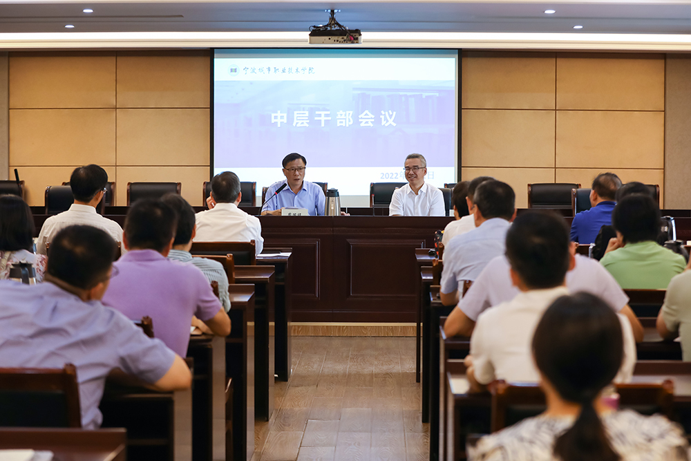 9月1日上午,我校召开中层干部会议,总结盘点上半年任务成效,谋划部署下半年重点工作。党委书记周国明主持会议并讲话。他首先肯定了暑期各条战线加压推进各项建设情况,也指出了当前工作中的短板和不足。他强调,要坚持党建引领,以坚定不移贯彻习近平新时代中国特色社会主义思想的政治站位,一切围绕“双高”建设的系统推进思维,切实做到高质量党建引领学校高质量发展。他要求,坚持“聚焦”,围绕双高任务实现以点带面、整体跃升,坚持“统筹”,确保新生报到及各项工作平稳有序,坚持“砺行”,推进作风建设行动,优化校园整治方案,完成奉化校区一期年内交付、师生入住,做好年度单位(部门)考核,坚持“引路”,加强新进教师和工作人员“传帮带”培训,做好青年教师引路人,助推青年教师“加速跑”。院长史习明对新学期重点工作进行了部署。他指出,在对标落实年初制定要点基础上,重点确保六项工作高质量完成。一要持续有效推进双高任务高质量完成,以人才培养实效检验工作成效;二要推进课程建设再上台阶,以课程引领优化教师未来成长路径;三要确保奉化校区建设准时完成,倒排时间、压茬推进;四要推进校友会建设初见成效,寻根校友骨干,成立校友总会;五要高质