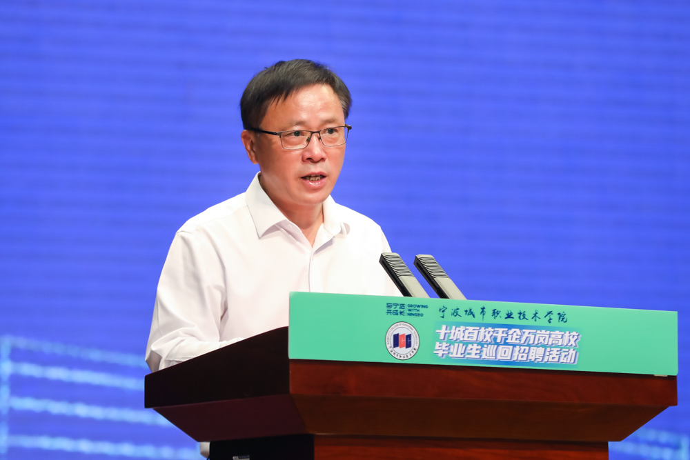 6月1日上午,“十城百校千企万岗”高校毕业生巡回招聘活动暨星空官方入口专场宣讲会在学校综合楼礼堂召开,同步进行了线上直播。宁波市人社局党组成员、副局长徐承志,宁波市人社局人才开发和市场处处长方建光,宁波市人才服务中心副主任石坚,宁波制造业“500强”“单项冠军”企业宁波博威合金材料股份有限公司人力资源总监张宪军、校友企业宁波传祺缝纫科技有限公司总经理毛科杰等领导和嘉宾参加了活动。学校党委书记周国明,相关职能部门、各二级学院领导,部分毕业生及在校生代表参加了宣讲会。会议由学校党委委员、副院长潘菊素主持。党委书记周国明在宣讲会上致辞。周书记向与会的各位领导和嘉宾介绍了学校的发展历程、人才培养、育人成效及未来发展方向。他表示,学校坚守育人初心,坚持“以服务为宗旨,以就业为导向”的办学理念,构建“素质引领、校企一体、分类培养”的人才培养模式,紧紧围绕宁波市支柱产业发展,为地方经济社会发展提供强有力的人才和科技支撑。毕业生中有超50%的学生留在宁波工作和生活,为宁波地方经济的发展贡献着积极的力量。同时他热切希望同学们能够“学在宁波、留在宁波、热爱宁波、服务宁波”。徐承志副局长以《青春“甬