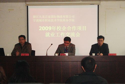 12月25日,商务学院召开“校企合作项目”就业工作交流会。浙江九龙百富国际物流有限公司董事长林建华在交流会上向参加商务学院与浙江九龙校企合作班的全体学员承诺,只要学员们毕业后愿意在九龙公司工作,公司将