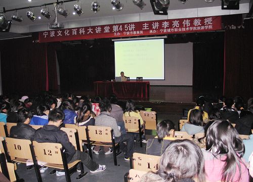 11月18日下午,宁波大学李亮伟教授走进了旅游学院的旅游大讲堂,为我院师生作了题为《宁波旅游文学纵横谈》的讲座。此次讲座也是宁波文化百科大讲走进城院系列活动之一,500多师生现场聆听了讲座。