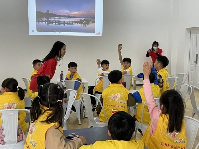 图为地理中国课现场。3月12日,姜山镇“公益小火车·一起向‘姜’来”研学项目邀请到宁城院国际学院的老师为小朋友们带来一节地理中国课。“这是哪里啊,你们认识吗?”鲍一菲老师向小朋友们提问。“