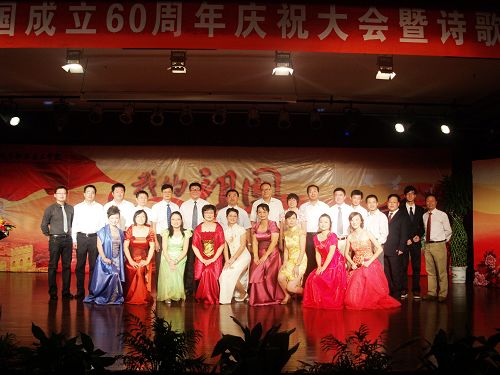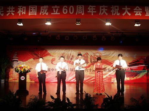 9月29日,艺术大楼演艺厅内音乐回旋,诗音绕梁,学校建国60周年庆祝大会暨“我的祖国”诗歌朗诵会在这里隆重举行。校领导李维维、李太武、颜炼钢、潘菊素、季锦旗及校老领导楼玉琦、钱理文与六百余名师生一起观