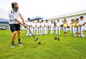 梁久学教授正亲力亲为指导学生。纸上谈兵同样生动。奋力挥杆。进球了!校园的一角,绿色的草坪上,几条塑料绳隔出一条条球道。10多个同学分成两队,趁着中午休息,正在起劲地练习如何挥杆击球。梁久学教授站在一旁