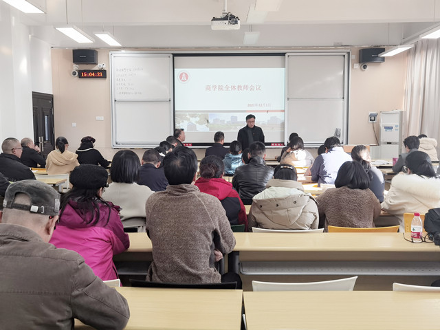 12月1日,党委书记周国明,党委委员、组织部长王志龙出席商学院全体教职工大会,宣布关于选取商学院作为党总支领导下的院长负责制试点单位的决定。周国明充分肯定了商学院党总支近年来的工作成绩,对商学院院长胡
