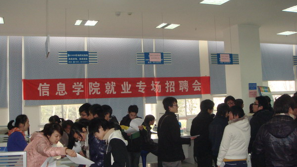 为更好地推进我院2011届毕业生就业工作,广开就业渠道,为毕业生提供更多就业机会。我院于2011111日,在艺术楼一楼举行了“信息学院就业专场招聘会”。宁波江东凯硕科技有限公司、嘉博教育培训学校等十余家企业前来参聘,能容纳100余人的招聘会场中,挤满了各个学院的应届毕业学生。部分大一大二学生也参与观摩,初步了解就业市场形势,场面火爆热烈。
