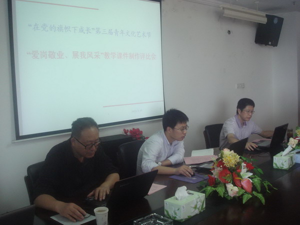 5月18日下午,庆祝中国共产党90周年华诞的“在党的旗帜下成长”第三届青年文化艺术节系列活动之——“爱岗敬业、展我风采”教学课件制作评比会在6—709举行。本次比赛由信息学院分工会承办,由校工会推荐的教务处、校督导老师及承办单位负责人组成评委,评比会在校工会副主席王军、周雅静两位老师的见证下顺利开展。
