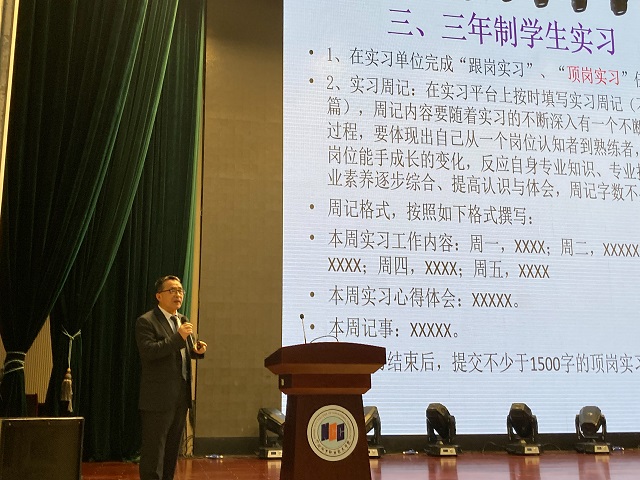 副院长潘世华在会上做动员讲话,他勉励同学们,在即将开启的“2+1”人才培养模式的崭新一年,在企业继续深耕专业,将理论知识运用到实际操作中去,认真完成教学计划规定的顶岗实习,希望大家能够及时转换角色,抓住实习机会,在岗位上学习新技能,培养新能力。同时,潘副院长还就实习期间毕业班级的课业安排和相关教学任务做了详细部署和解读。