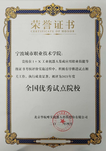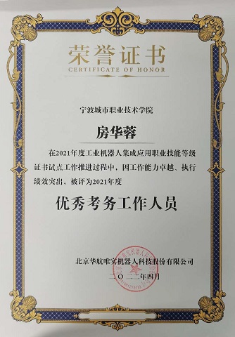 近日,北京华航唯实机器人科技股份有限公司发文,公布了1+X工业机器人集成应用职业技能等级证书2021年度试点工作优秀单位和个人,我校荣获该证书“全国优秀试点院校”荣誉称号,房华蓉老师被评为“优秀考务工作人员”。