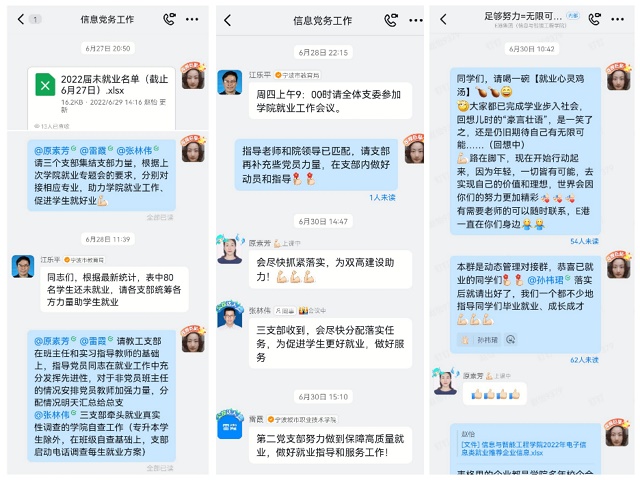 信息与智能工程学院党总支积极响应学校党委号召,将学习贯彻浙江省第十五次党代会精神落到实处,坚持以学生为本,将“保就业,促就业”作为学院总支工作重心,对于就业困难学生,及时提供最新招聘信息,实现分类推荐,一人一档,一生一策,确保以“精准服务”为目标,全心全意帮助学生就业,真正实现党建引领促就业,真情服务促成才。相信在学院党总支的领导和各支部的倾情对接下,学院2022年毕业生就业工作定会圆满顺利。
