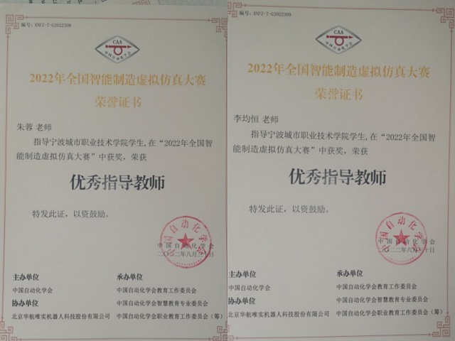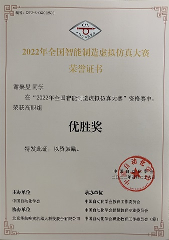 2022年4月底,由中国自动化学会主办的2022年全国智能智造虚拟仿真大赛资格赛顺利举行,受疫情影响,本次比赛采用线上方式进行。信息与智能工程学院教师朱蓉和李均恒指导谢燊昱同学在比赛中沉着应对,稳定发挥,最终以优异成绩获得优胜奖并成功入围决赛,同时,两位带队老师获得优秀指导教师称号。