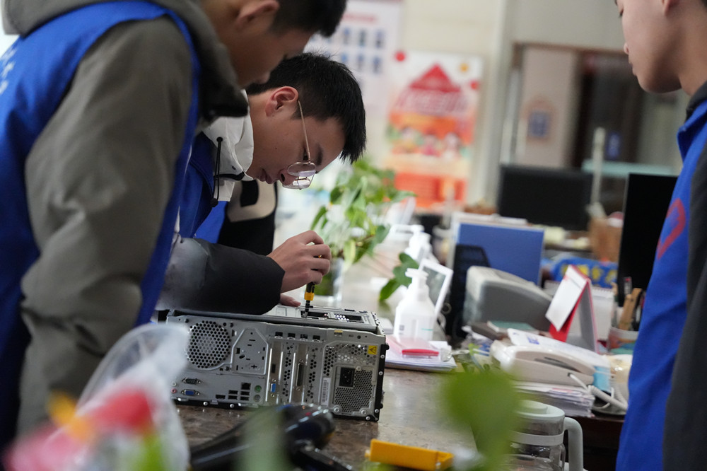在现场,E港的志愿者们发挥专业优势,为社区居民提供电脑机箱维修维护、手机贴膜等便民服务。拆装机箱、清理风扇,志愿者们手法干脆,熟练精湛。社区的居民们反响热烈,前来问询的人络绎不绝。