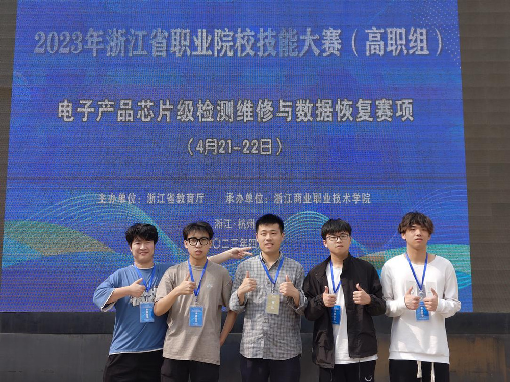 同日,“电子产品芯片级检测维修与数据恢复”赛项在浙江商业职业技术学院成功举行,全省25支代表队展开激烈角逐。信息学院邱文哲、王昊斌团队在学校教师雷霞、李家豪的指导下获得省三等奖。