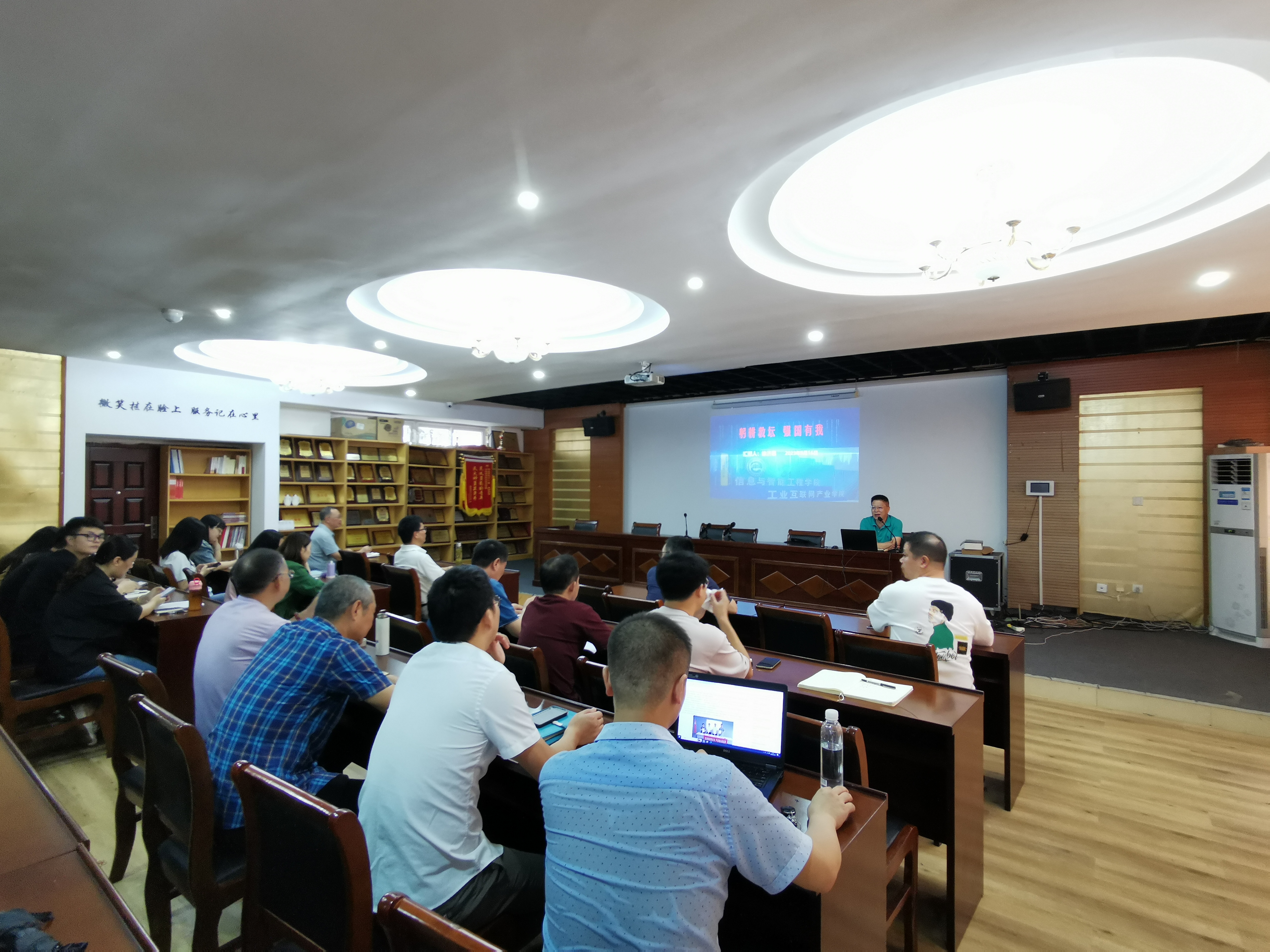 院长徐济惠以习近平总书记在第三十九个教师节上的讲话为引,号召全体教师学习教育家精神,牢记为党育人,为国育才的光荣使命。会上,徐济惠做了题为《躬耕教坛,强国有我》的主题报告,介绍了假期期间学院教师在学生技能竞赛、教育教学、学术科研、师资队伍培训、校企合作等方面取得的成绩。他还就学院下一步重点工作做了详细部署。江乐平就开学初学生报到工作做了任务分解,要求全体辅导员和班主任关注学生开学返校和思想稳定,结合学校校庆做好校友工作,同时,他提醒全体教师提高思想认识,关注国家安全。副院长潘世华就新学期教学工作做了详细解读,要求全体教师上好开学第一课,做好课堂考勤,密切联系顶岗实习学生,关注学生学习及思想动态,及时引导,答疑解惑。副院长万旭成就实验室改造等事项做了详细汇报。